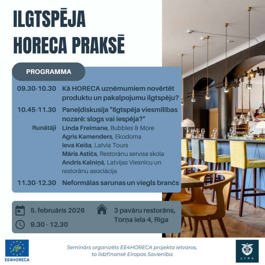 Mācību sesijā “Kā HORECA uzņēmumiem novērtēt produktu un pakalpojumu ilgtspēju?” tiks skaidrots, kā HORECA uzņēmumi var praktiski izvērtēt savu produktu, pakalpojumu un ēku ilgtspēju.