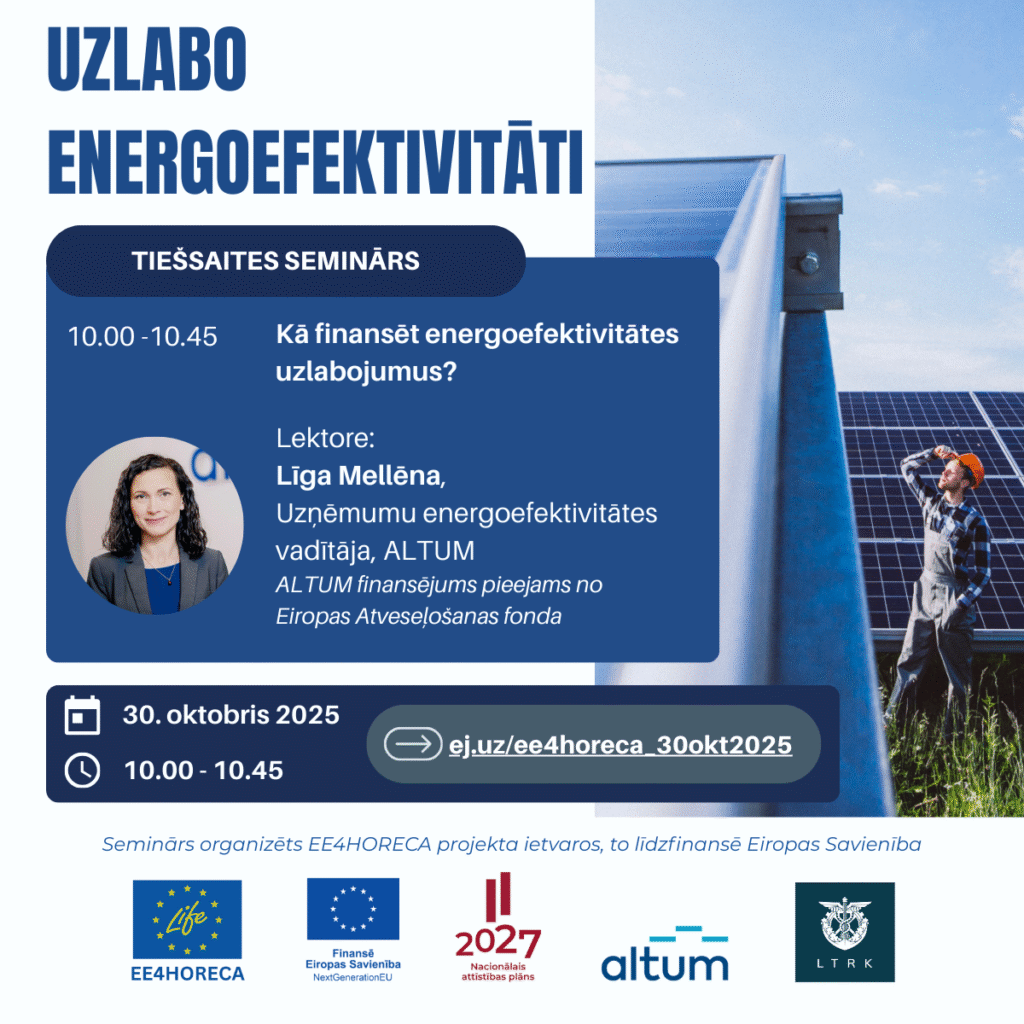 Tiešsaistes seminārs par atbalstu un pieejamajiem finanšu instrumentiem energoefektivitātes paaugstināšanai MVU, tajā skaitā HORECA vērtības ķēdes uzņēmumiem. Seminārs tiek rīkots sadarbībā ar ALTUM. Šis ir trešais tematiskais seminārs, kas tiek rīkots EE4HORECA projekta apmācību ietvaros.