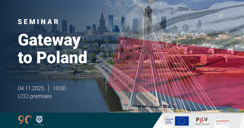 The Latvian Chamber of Commerce and Industry (LCCI), in cooperation with the Embassy of the Republic of Poland in Riga and the Polish–Latvian Chamber of Commerce and Industry, warmly invites entrepreneurs and interested stakeholders to the seminar “Gateway to Poland”, taking place on 4 November 2025 at 10:00.
